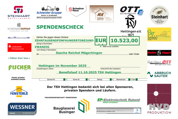 Der TSV Hettingen bedankt sich bei allen teilnehmenden Läufern und Läuferinnen, den Sponsoren und privaten Spendern. Aus diesem Gesamtbetrag ergeben sich 2,94 € pro erlaufenem Kilometer.