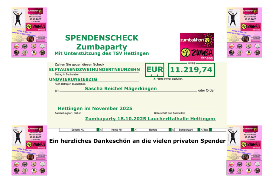 Eine weitere Spende von 11.219.74 € konnte durch Markus Baier aus dem Erlös der Zumba-Party, in Kooperation mit dem TSV Hettingen vom 18.10.2025 in der Laucherttalhalle Hettingen, überreicht